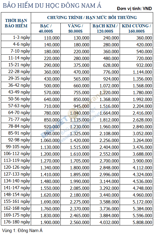 Bảng phí bảo hiểm du học nước ngoài dưới đây áp dụng mức phí khi du học tại các quốc gia thuộc Vùng Đông Nam Á, nhưng chỉ gồm các nước cụ thể như sau: Brunei, Cam-pu-chia, Indonesia, Lào, Malaysia, Myanmar, Philippines, Singapore và Thái Lan