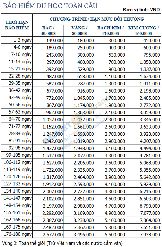 4.3. Phí bảo hiểm du học phạm vi toàn cầu