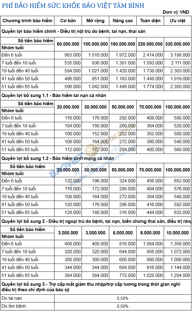 3. Biểu phí bảo hiểm tải file tại đây: Biểu phí Bảo hiểm Bảo Việt Tâm Bình